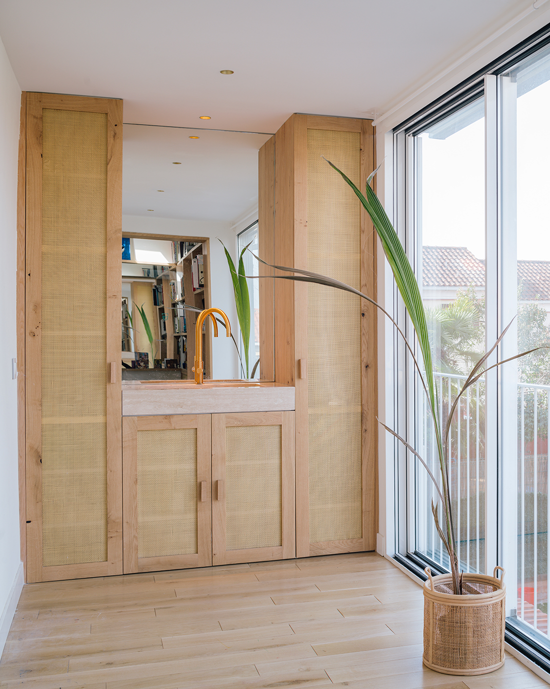 An austere and warm design, molded-in wood, and wicker, in which the sunlight combines interior and exterior, through multiple visual games.