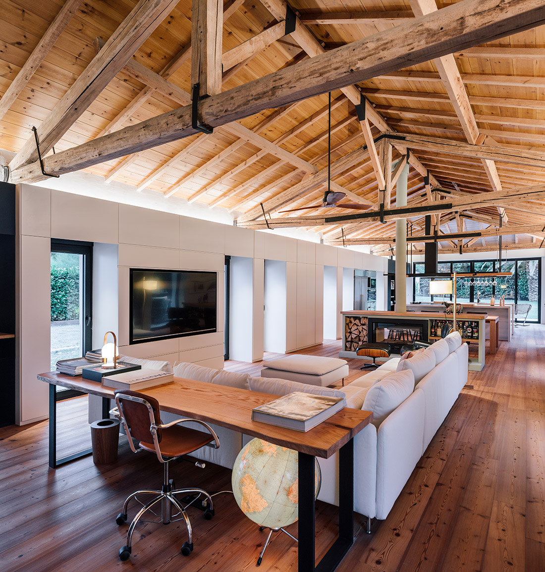 The project includes a refurbishment of an existing building and the creation of new construction to complete the program of this particular house. The existing building is annexed to a larger building and separated from it by a large covered passageway. Although it was used as a dwelling, it was originally a stable for livestock, and this is reflected in its simple, unpretentious architecture and a very basic construction system, based on load-bearing walls and a roof of wooden beams covered by tiles. The intervention in this piece is based on respect for the existing and its conservation, for which the roof is maintained and the north and west facades are rehabilitated, although the openings are modified with more forceful gestures, seeking a dialogue between the typical rural architecture of the area and its new, more contemporary use. The east and south facades, given their poor condition, are replaced in their entirety. While the south façade opens completely to the garden looking for the relationship of the interior space with the natural environment, the east façade presents a marked full-empty rhythm that generates a more controlled visual connection of the interior-exterior. In this volume, the program is divided into 3 well-differentiated zones: a large open and continuous space, ordered through free-standing pieces and housing a living-dining room-kitchen. It is the heart of the dwelling, where the absolute protagonist is the large wooden roof, which is manifested in its entirety. Hidden behind a shelf, there is a bedroom with a bathroom and dressing room, and finally, on the first floor, an independent second bedroom with a bathroom, kitchen, and living room. The newly built pavilion, with a more rational architecture, but preserving its simplicity and austerity, consists of a large covered porch and a series of rooms that complete the housing program: txoko, sauna, and guest room. The swimming pool is located in the resulting space between the two buildings, facing south and enjoying marvelous views of the Cantabrian mountains.