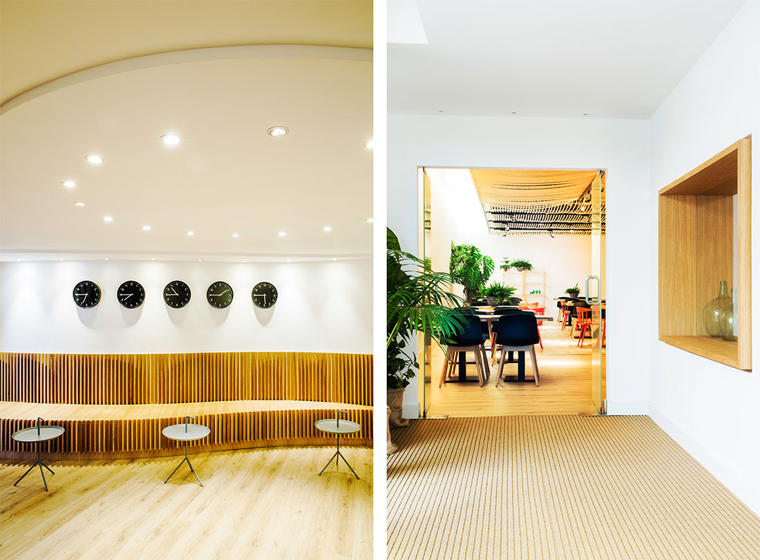 The remodeling of the room was completed with a large wooden floor parallel to the plane of roof ropes, reflecting the linearity and chromaticity of it. Vertical walls are also located for luminosity.