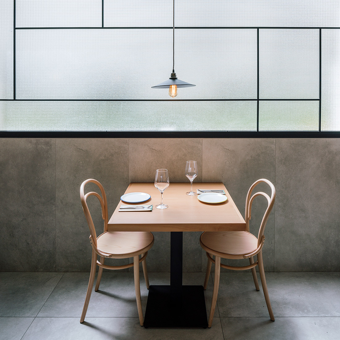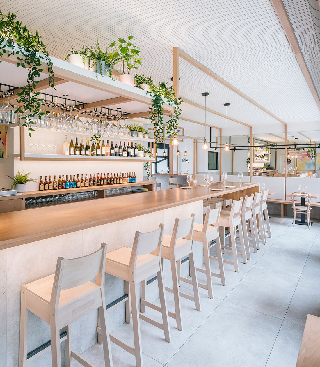 The Project is situated in Tetuan Street in Santander. It is one of the main spots of the gastronomy activity in the whole city where the traditional seafood restaurant are abundant. “La Hermosa de Alba” proposes a different cuisine, based on the product of the land and applying different culinary techniques, in a casual, innovative and fresh environment. The place is small and is located in a building between blind walls. It is accessed from the north with a small facade, while the south facade faces a courtyard. Treatment of the walls in two colors is proposed. The gray ceramic floor continues through the vertical walls forming a high baseboard throughout the space, whereas the rest of the vertical walls and the ceiling are white, looking for a neutral, bright and functional essence. The rectangular floor space is organized with a plot of parallel lines in its longitudinal direction, equidistant from each other. These “lines” are materialized by means of wooden slats that run continuously through the walls and ceiling. The “lines” are broken to solve the different functional needs, such as running benches, high tables, storage areas, the bottle rack, etc. At the same time that they order elements, they sculpt the space, generating a multitude of perspectives and overlays of frames depending on the point of view in which we place ourselves. A large central bar is presented as the main element of the space, is located in the middle of it and becoming the center of operations of the restaurant. The rest of the elements such as metal carpentry and lighting, continue with the formal linear premise, enhancing the game of overlapping patterns and geometries raised by the wooden slats. Only in specific places, such as the façade, the kitchen and the toilets, the ceramic tiles turned into bright colors and take importance, as opposed to the neutral and calm composition formed by the vaporized beech wood, the ceramic color cement gray and white rustic monolayer.