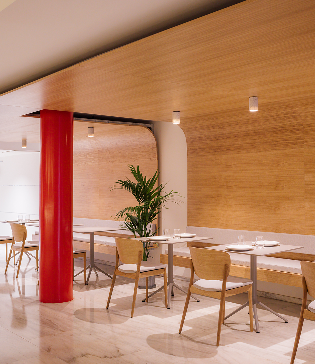 For this purpose, thin sheets of wood are conceived as a “tailor-made suit” that fits the pillars, walls and ceilings. A skin that “floats” lightly in the space and generates the necessary elements for the required use, ceiling to house lights, seat for tables and shelves in the backbar.