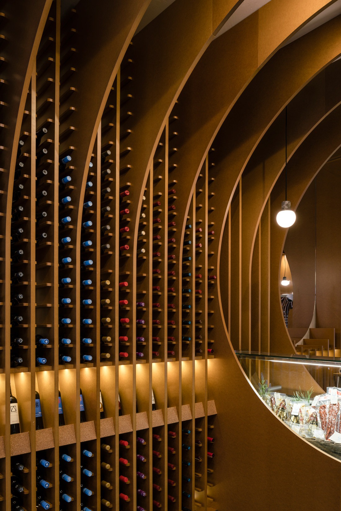 The juxtaposition of several circumferences in transversal and longitudinal direction of the local creates a space where the required situations appear such as the counter, tasting table and exhibition-sale space.