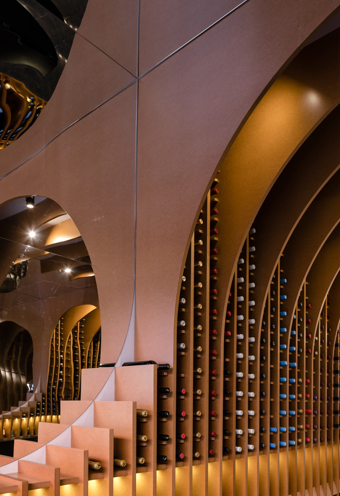 Finally, to complete the space, it is necessary to mention the different materials. There are three materials in this project: wood is used for the ribs system as the barrels, stone for the floor as the antique cellars, and the mirror material which generates amplitude and an atmospheric world of reflections where those circumferences seem to contain some kind of liquid.