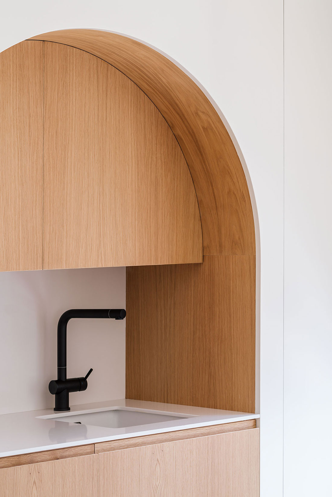 The place is located in a corner and it has two facades with a strong rhythm of windows with a semicircular top shape. This gives the space a great personality. These elements are so strong that it is going to be the leitmotiv of the local morphology itself. To solve the functional needs, the rounded arch is used as the only geometry, giving continuity and enhancing the pre-existing spatial language. In a completely diaphanous place, two elements are inserted in a way that organize the space to adapt it to the needs. The first of these elements contains all the services (toilet, office-kitchen, room for facilities and storage), while the other defines the two existing meeting areas, independent of each other, but visually connected. The rest of the space is conceived as a common room where work areas, relax and relationship are mixed. It is the distribution of the furniture itself, which establishes the circulations and stays, generating a flexible space that allows multiple configurations. The natural oak material is present in the holes of the arches and the floor. This material turns paramount due to the absence of color of the rest of the furniture and furnishings, creating a pleasant feeling of harmony.