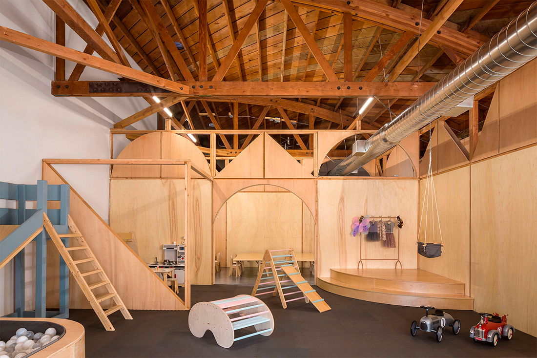 La primera un área de bienvenida, compuesta por cafetería y tienda, la segunda y central, el parque infantil, corazón del proyecto y la tercera y última, más resguardada, un área de trabajo o co-working.