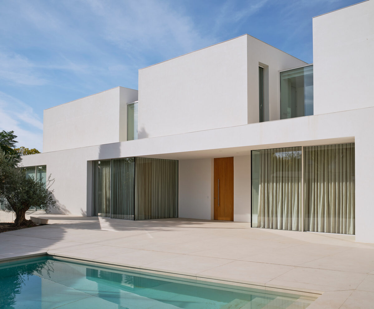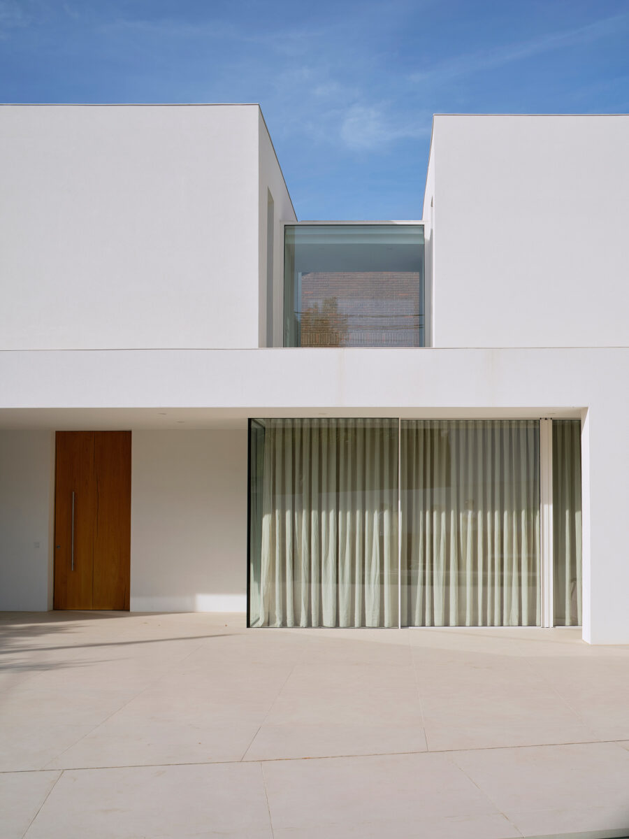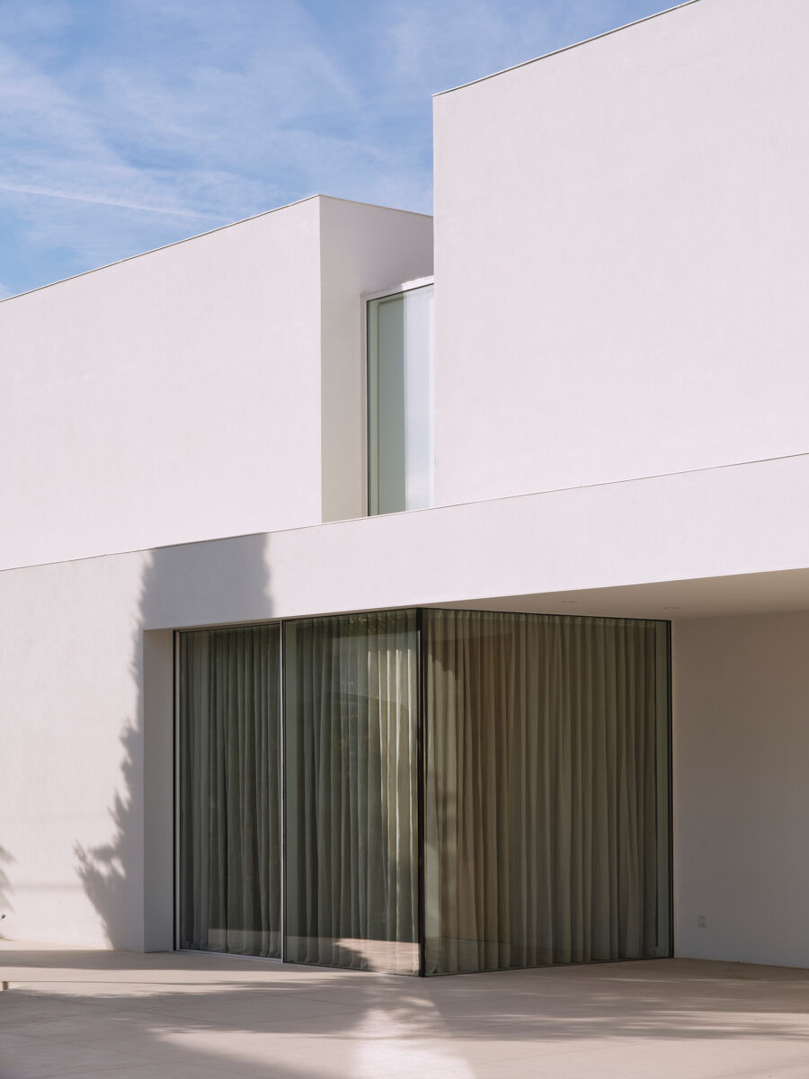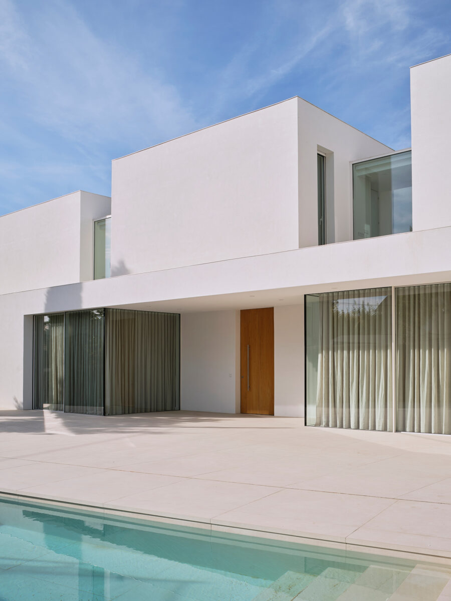 El proyecto se concibe como una superposición de estrategias volumétricas diferenciadas por niveles. La planta baja se proyecta como una plataforma libre y diáfana que ejerce de soporte para el programa superior, abriéndose en casi su totalidad a través de grandes frentes acristalados. Esta configuración busca la máxima permeabilidad con la parcela, permitiendo que las zonas de estancia se extiendan visual y funcionalmente hacia el jardín y la piscina. Sobre este basamento ligero y transparente, se asientan tres volúmenes superiores que recuperan el carácter masivo y escultural de la obra. Estos bloques de mortero natural se cierran deliberadamente hacia la fachada principal, protegiendo la intimidad de la familia, mientras que en sus otras orientaciones se abren de forma estratégica para captar la luz natural y las vistas deseadas. La comunicación entre estos tres cuerpos independientes se realiza mediante pasarelas de vidrio muy ligeras. Este recurso permite enfatizar la autonomía de cada volumen y genera una transición liviana que inunda de luz el núcleo central, favoreciendo las visuales cruzadas en toda la planta alta.
