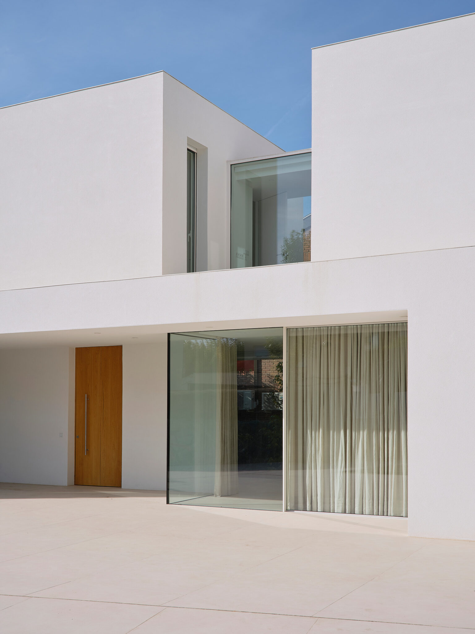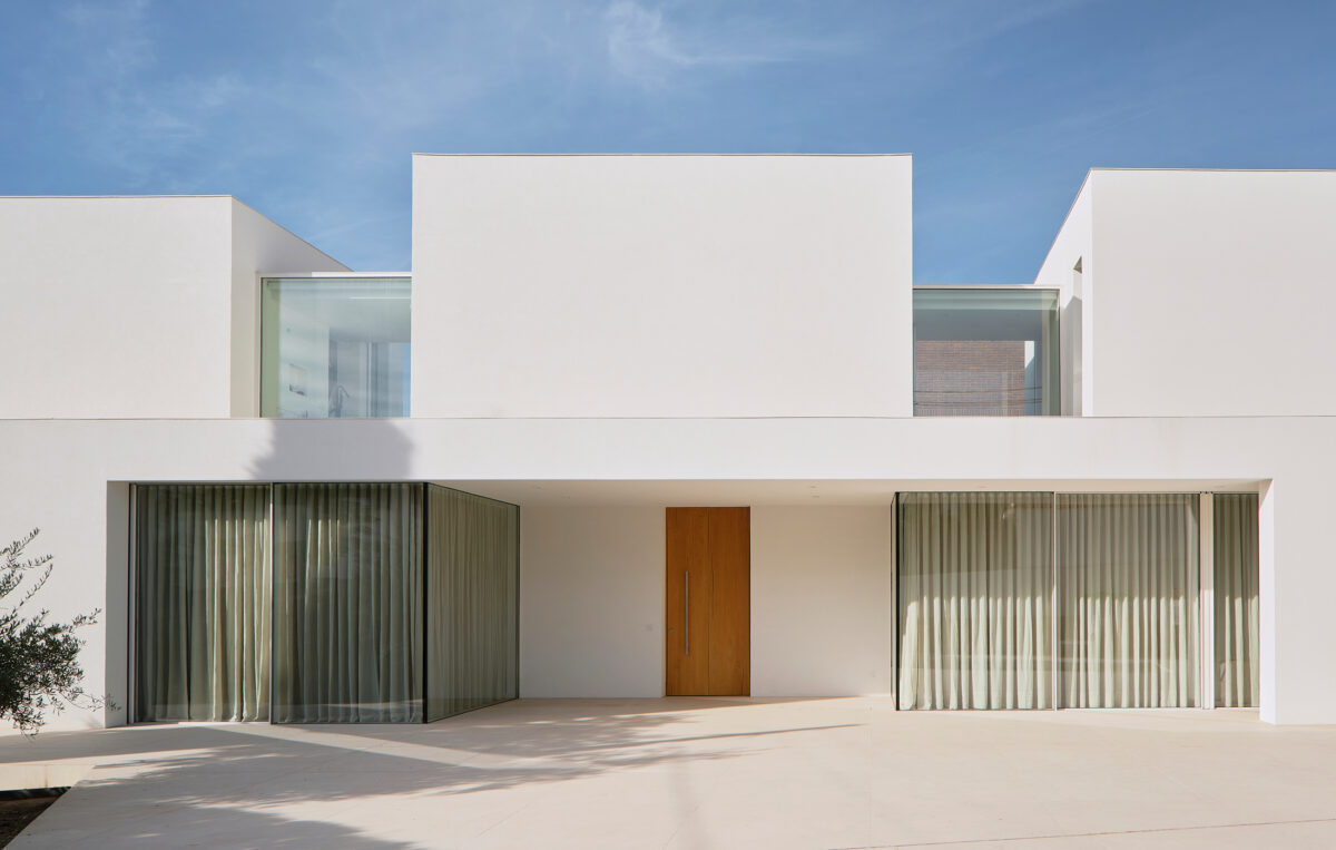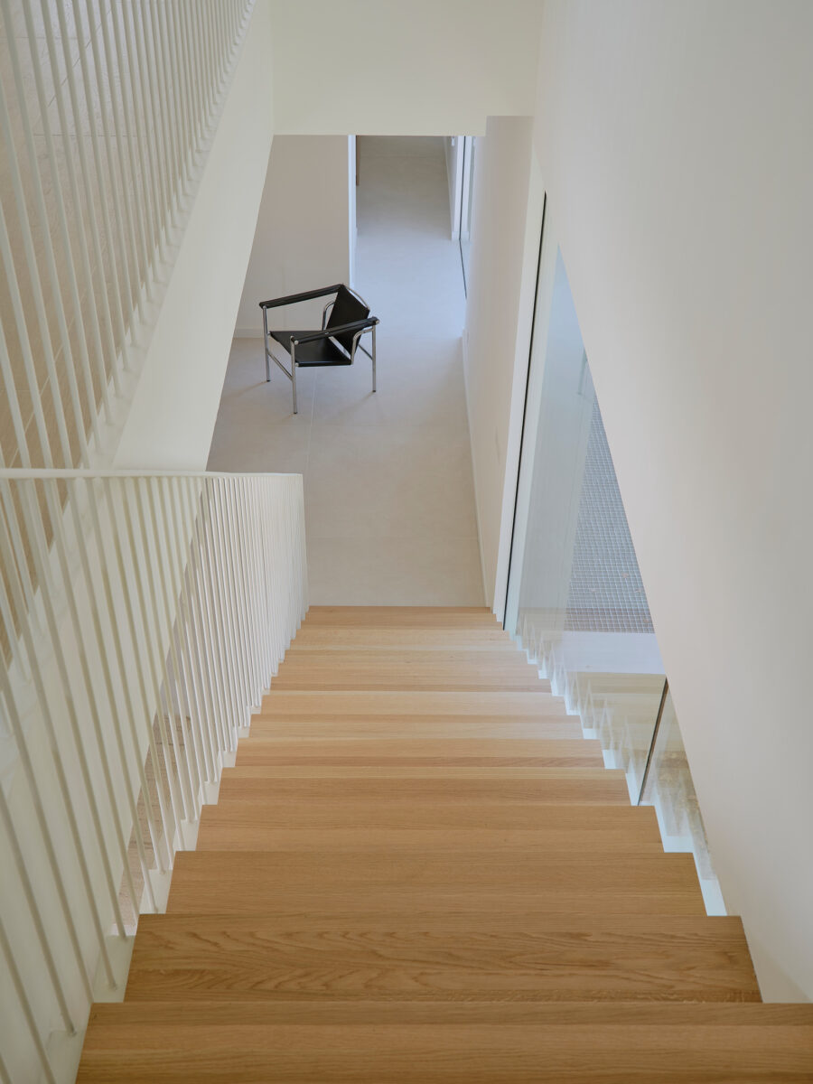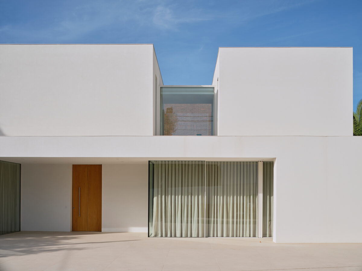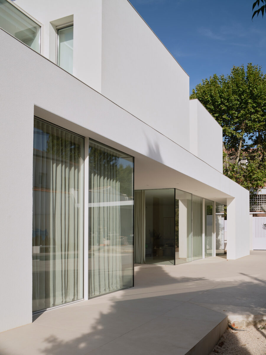 El proyecto se concibe como una superposición de estrategias volumétricas diferenciadas por niveles. La planta baja se proyecta como una plataforma libre y diáfana que ejerce de soporte para el programa superior, abriéndose en casi su totalidad a través de grandes frentes acristalados. Esta configuración busca la máxima permeabilidad con la parcela, permitiendo que las zonas de estancia se extiendan visual y funcionalmente hacia el jardín y la piscina. Sobre este basamento ligero y transparente, se asientan tres volúmenes superiores que recuperan el carácter masivo y escultural de la obra. Estos bloques de mortero natural se cierran deliberadamente hacia la fachada principal, protegiendo la intimidad de la familia, mientras que en sus otras orientaciones se abren de forma estratégica para captar la luz natural y las vistas deseadas. La comunicación entre estos tres cuerpos independientes se realiza mediante pasarelas de vidrio muy ligeras. Este recurso permite enfatizar la autonomía de cada volumen y genera una transición liviana que inunda de luz el núcleo central, favoreciendo las visuales cruzadas en toda la planta alta.