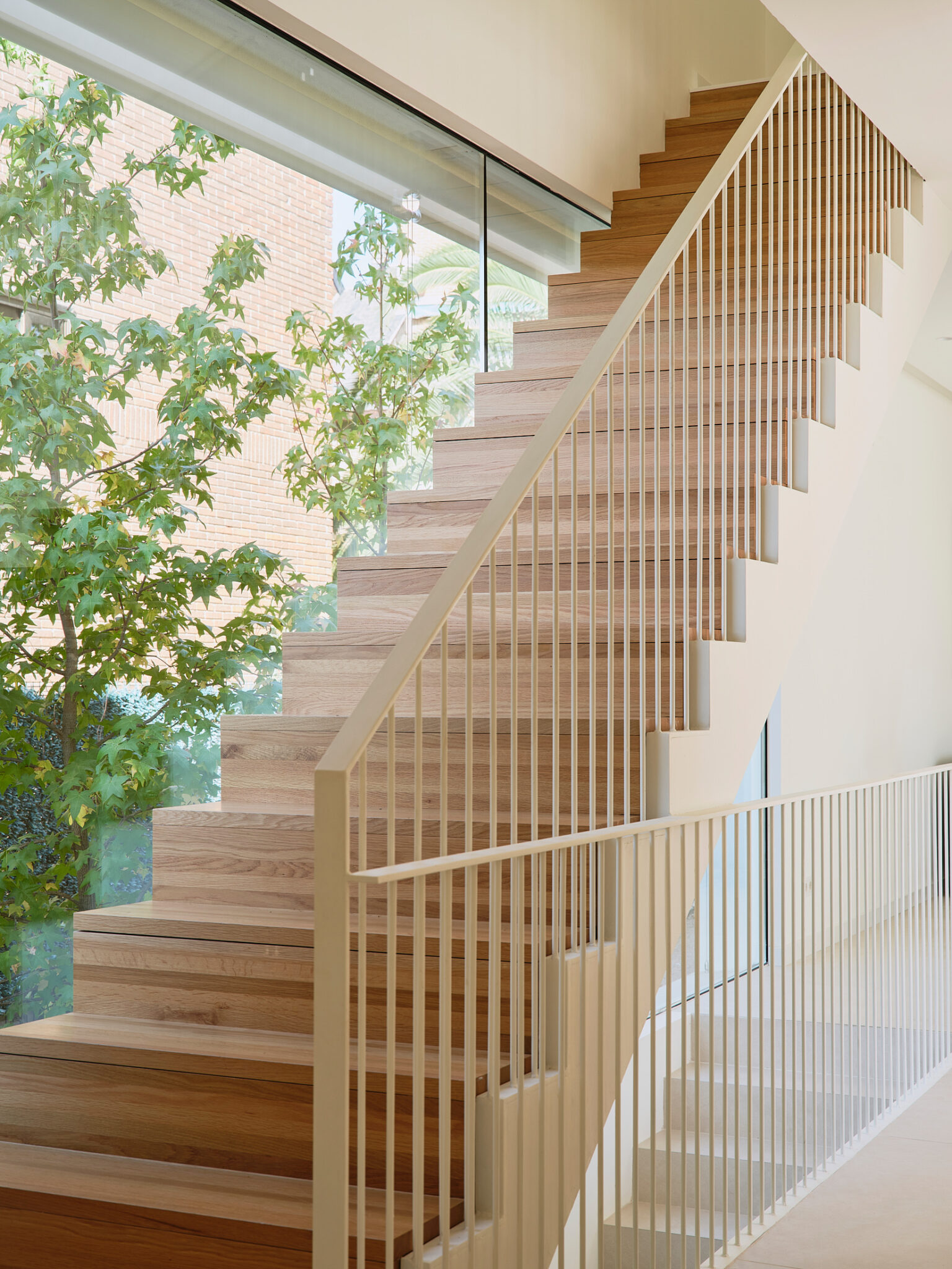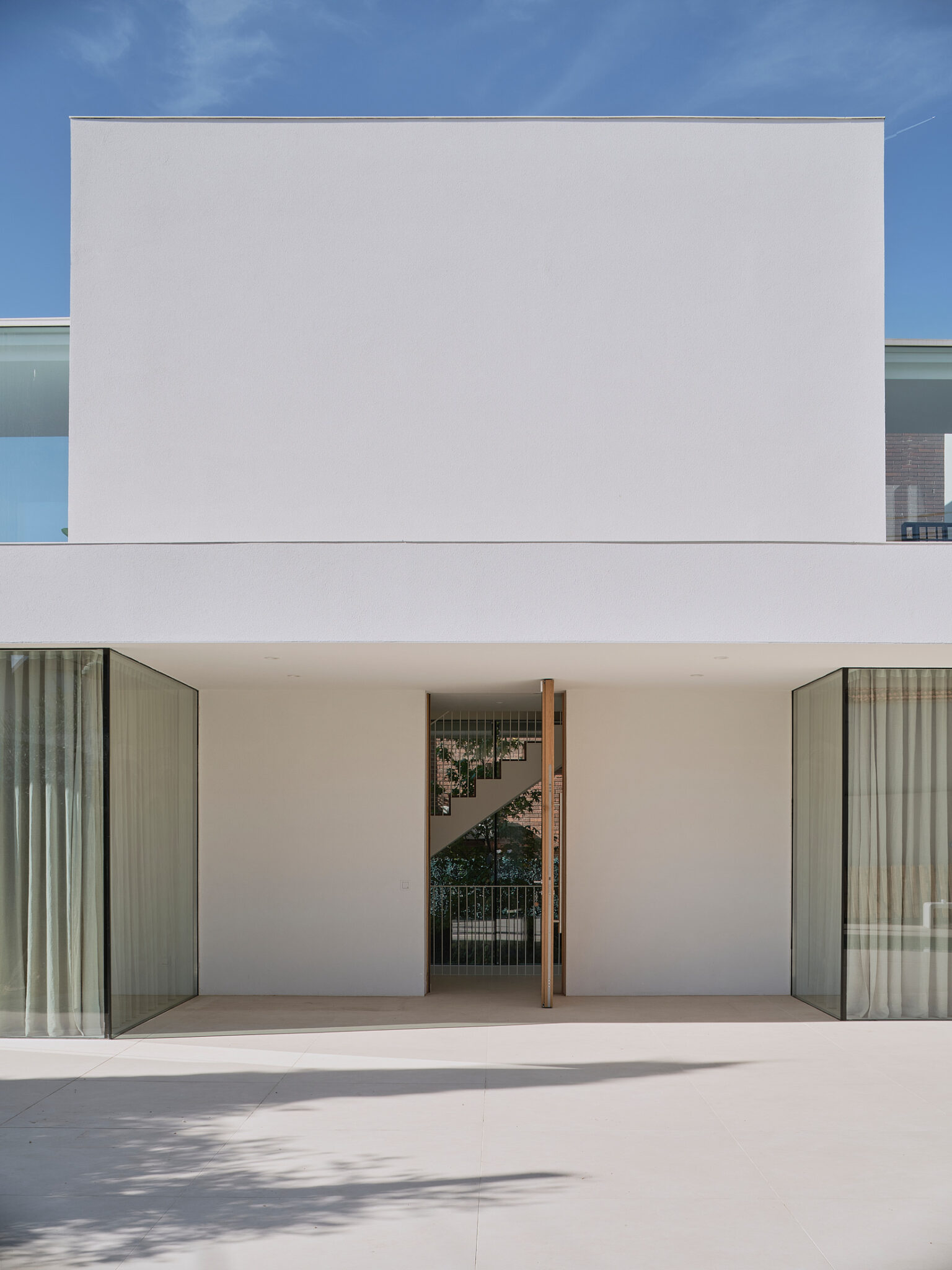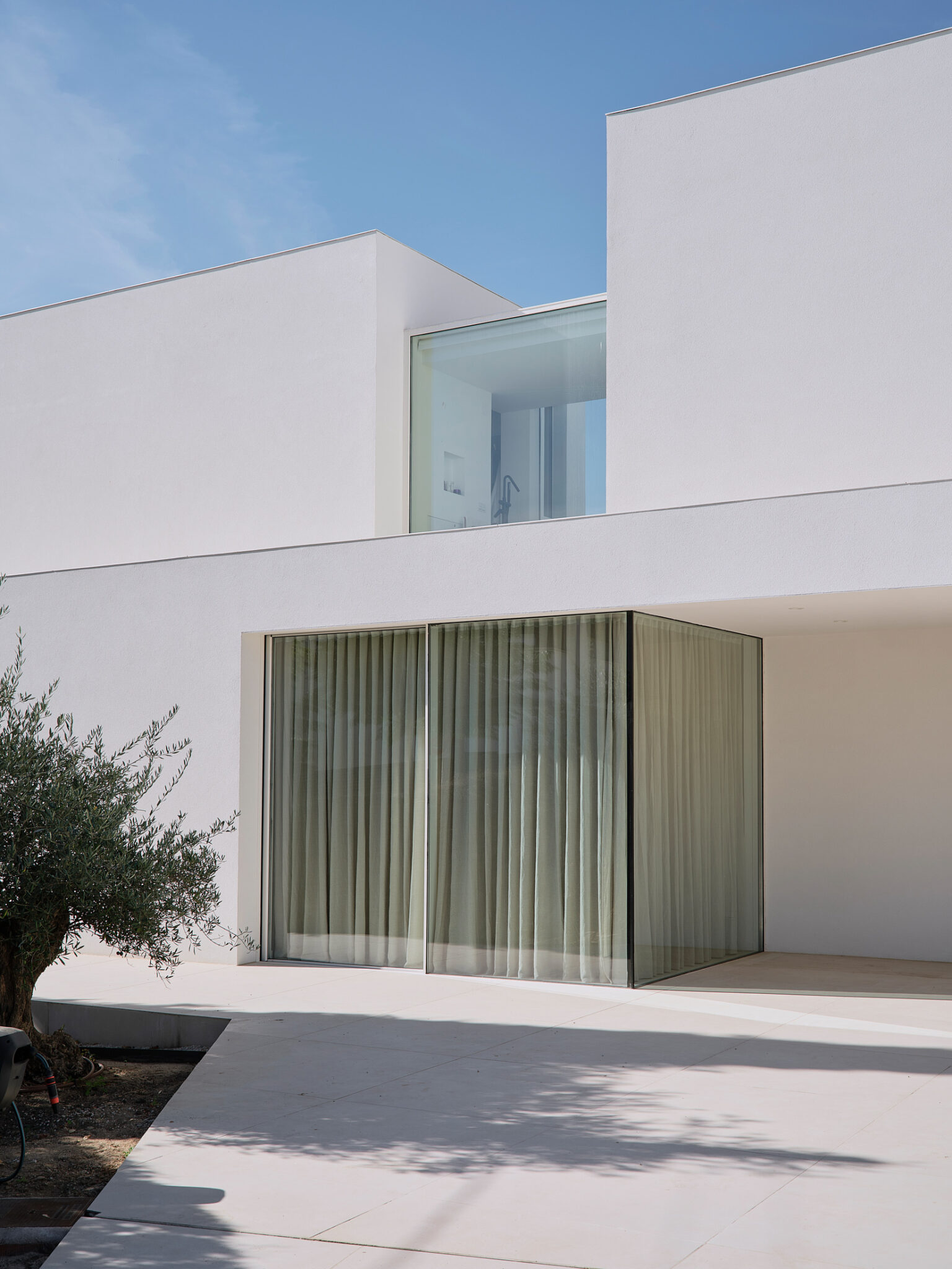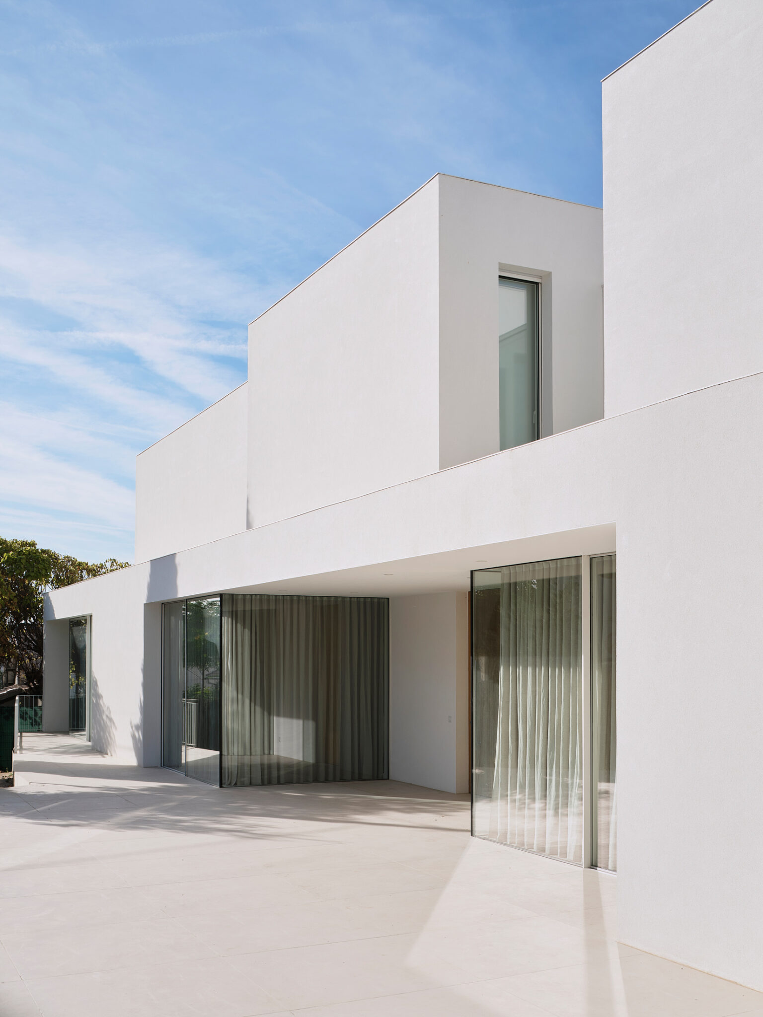 El proyecto se concibe como una superposición de estrategias volumétricas diferenciadas por niveles. La planta baja se proyecta como una plataforma libre y diáfana que ejerce de soporte para el programa superior, abriéndose en casi su totalidad a través de grandes frentes acristalados. Esta configuración busca la máxima permeabilidad con la parcela, permitiendo que las zonas de estancia se extiendan visual y funcionalmente hacia el jardín y la piscina. Sobre este basamento ligero y transparente, se asientan tres volúmenes superiores que recuperan el carácter masivo y escultural de la obra. Estos bloques de mortero natural se cierran deliberadamente hacia la fachada principal, protegiendo la intimidad de la familia, mientras que en sus otras orientaciones se abren de forma estratégica para captar la luz natural y las vistas deseadas. La comunicación entre estos tres cuerpos independientes se realiza mediante pasarelas de vidrio muy ligeras. Este recurso permite enfatizar la autonomía de cada volumen y genera una transición liviana que inunda de luz el núcleo central, favoreciendo las visuales cruzadas en toda la planta alta.