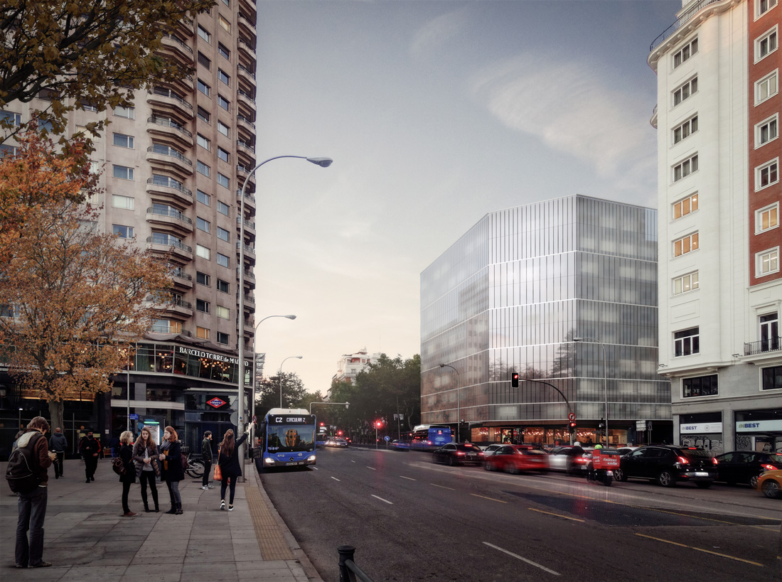Se propone un velo urbano que se integra con el nuevo espíritu y modernidad de la Plaza de España, reflectante y protector, sin intención de significarse, actuando como fondo de paisaje de la nueva realidad de su entorno.