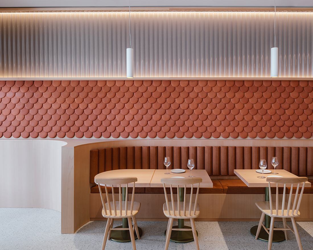 Con estos condicionantes proponemos un diseño que quiere traer al local el mundo marino, pero lejos de los tópicos del imaginario del mar. Lo planteamos con una abstracción materializada en texturas y formas que nos recuerdes a dicho mundo, tan presente en el entorno como en la comida.