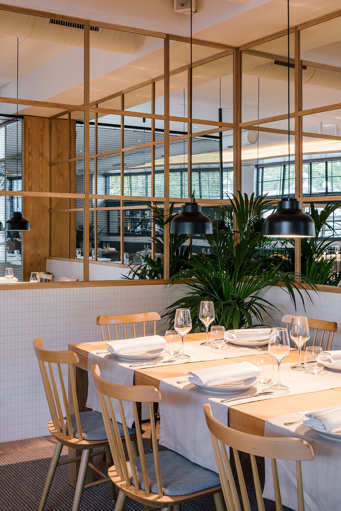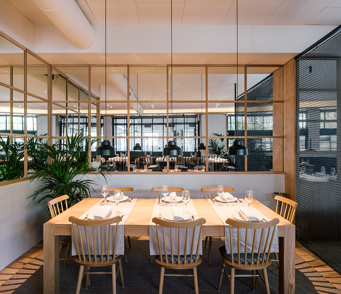 La banda cerámica perimetral nos permite dar carácter al local mientras protegemos las paredes de golpes y rozamientos. Está compuesta por un mosaico cerámico blanco mate de formato 1:2 rectangular de la pieza nos permite jugar con las direcciones de la misma en función de los diferentes paños, haciendo siempre encuentros a pieza completa entre piezas con diferente dirección.