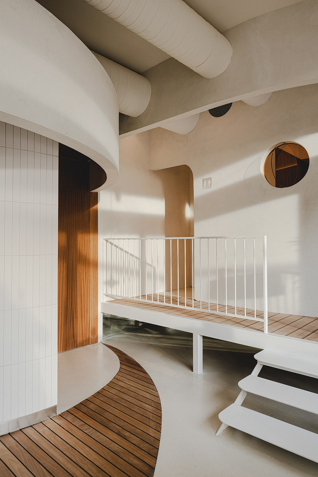 Cabe destacar el tratamiento interior de las cintas y volúmenes que conforman el edificio. Gracias a un cuidado estudio de las líneas horizontales del proyecto o despiece horizontal, se establece un orden nítido que ayuda a la armonización del proyecto y a la comprensión del espacio. Otro elemento muy característico del proyecto son sus baños, elevados sobre una estructura que traspasa los límites del local e irrumpe en su terraza exterior, a modo de embarcadero, elemento muy reconocible que impregna de carácter a ese espacio exterior. Los baños – o camarotes – se diseñan mediante dos únicos elementos, aptos ambos para el revestimiento de arquitecturas orgánicas y suaves: tablillas de madera de teca y un zócalo de piezas semicirculares cerámicas de misma anchura que las tablillas.