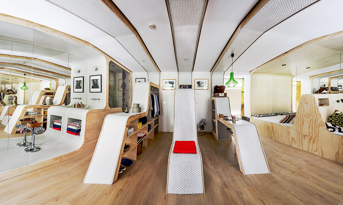 Paredes de espejo, pavimento de madera y revestimiento de cada uno de los pórticos con mosaico vitreo, confieren al espacio un carácter luminioso, alegre y cambiante. Asociamos diferentes tonalidades a los usos del espacio: dormir, trabajo, ocio, vestidor y baño.