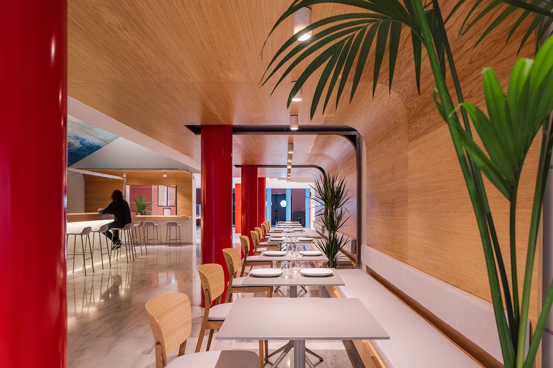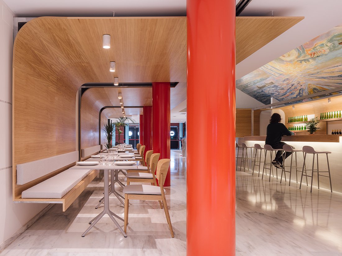Para ello se conciben unas finas láminas de madera, como un “una traje a medida” que se adecua a los pilares, paredes y techos. Una piel que “flota” ligera en el espacio y te genera los elementos necesarios para el uso requerido, techo para albergar luminarias, asiento para las mesas y estanterías en la trasbarra.