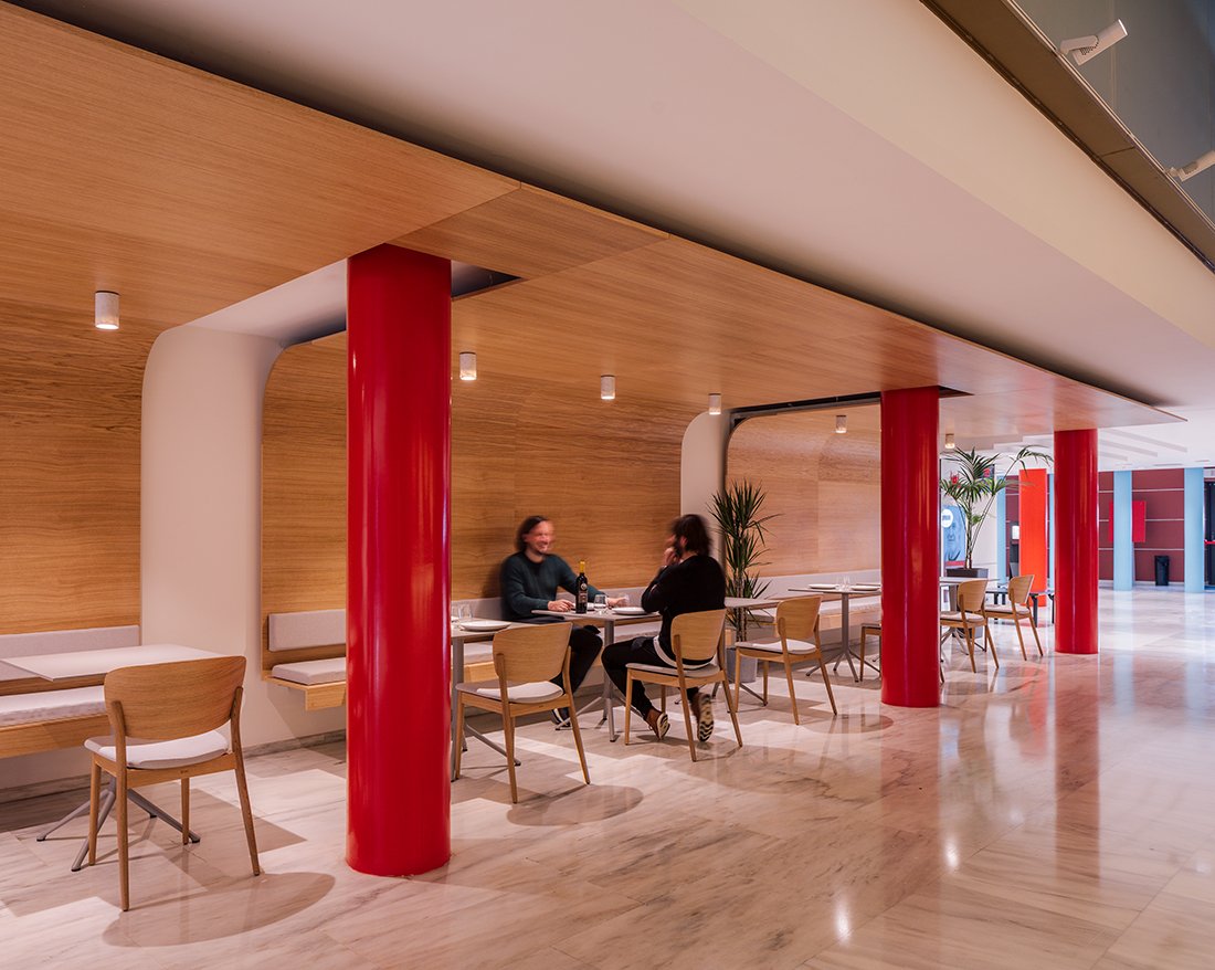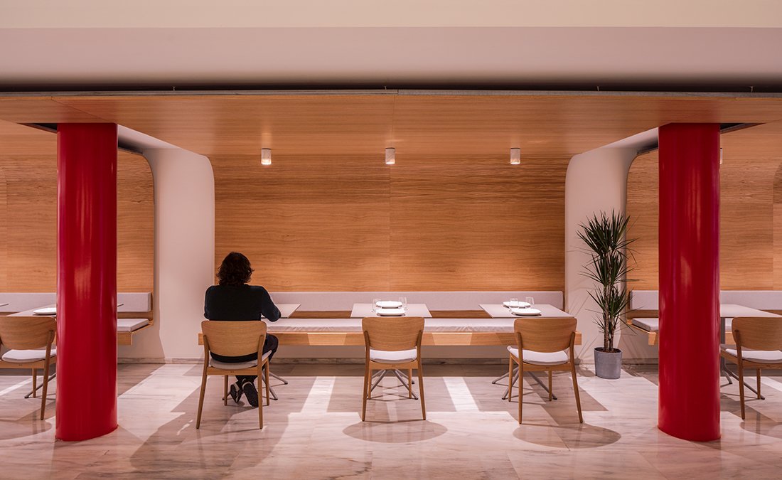 A nivel de materiales, la barra  es un volumen que nace del suelo continuando el mármol original, al igual que las luminarias también en mármol, pero para las láminas de este mínima “piel” se escoge la madera un material que no está presente en el proyecto original, para que la intervención se reconozca como un complemento de lo existente y no un intento de continuar con lo existente transformándolo.