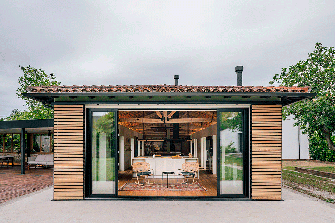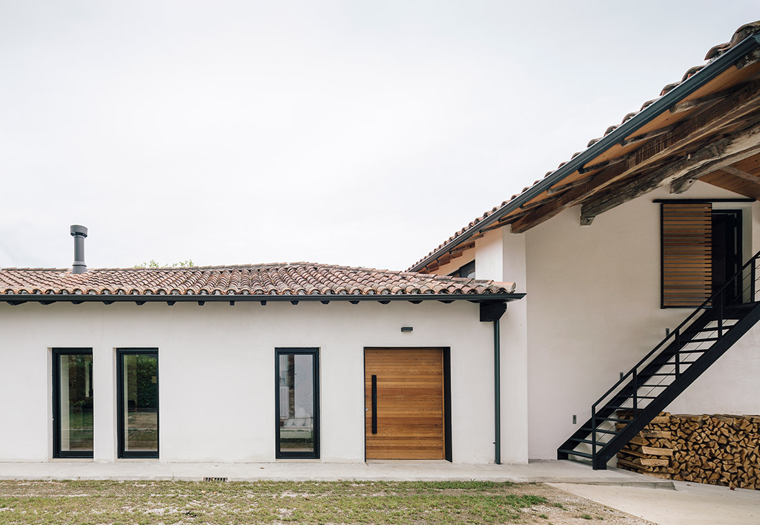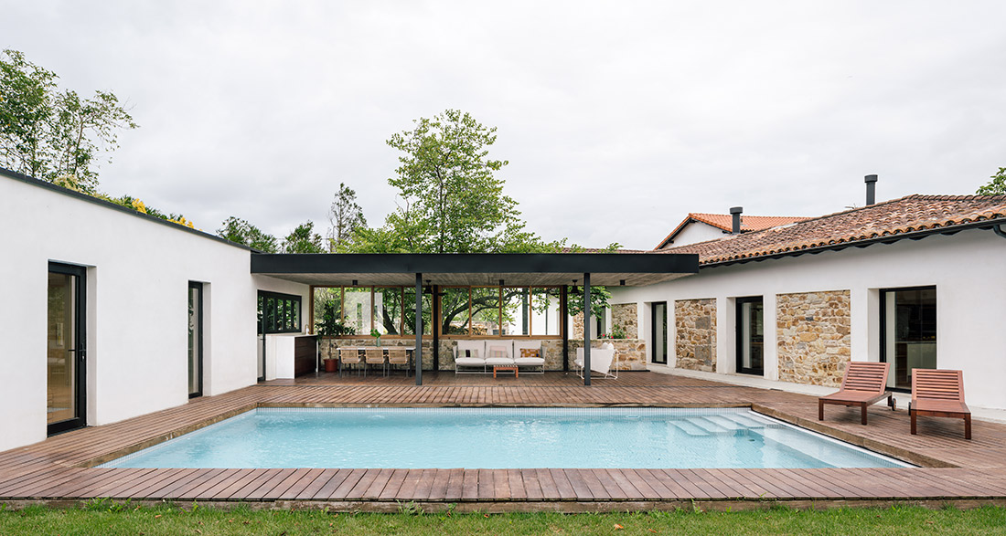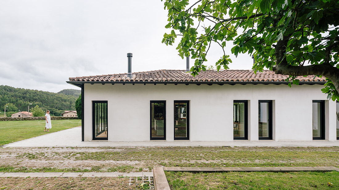 El pabellón de nueva construcción, de arquitectura más racional, pero conservando la sencillez y austeridad, consta de un gran porche cubierto y de una serie de estancias que completan el programa de la vivienda: txoko, sauna y habitación de invitados.