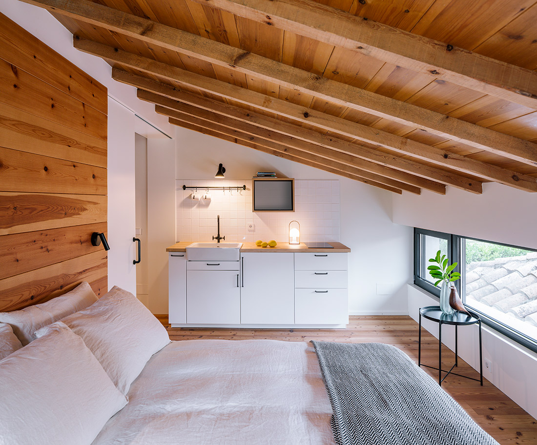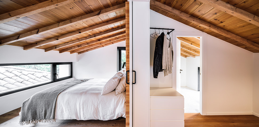En este volumen el programa se divide en 3 zonas bien diferenciadas: un gran espacio abierto y continuo, ordenado mediante piezas exentas y que alberga salón-comedor-cocina. Es el corazón de la vivienda, donde el protagonista absoluto es la gran cubierta de madera, que se manifiesta en su totalidad. Oculto tras una estantería, encontramos un dormitorio con baño y vestidor, y, por último, en planta primera, un segundo dormitorio totalmente independiente con baño, cocina y sala de estar